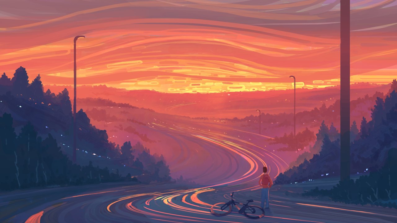 道路、日落、自行车、插画风格、自由向往